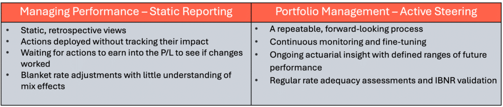 Use the results so far to decide where to grow, maintain, or improve. Define resulting actions that are measurable so you can quantify their impact on GWP, loss ratio, and overall portfolio shape.